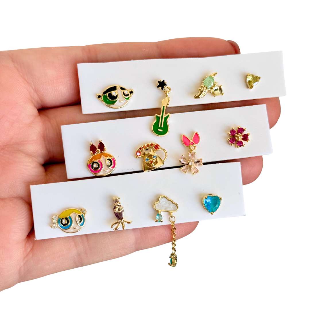 Este producto se vende por SET de 4 piezas. Aros tipo pasante de PLATA 925 laminada en oro 18K. Posee incrustaciones de cristal K9 GLASS. Brillo y color duraderos. Apto uso cotidiano. Tamaño aproximados: 1cm ¡Un must-have para marcar tendencia y lucir un look que solo Peligro Rocks puede ofrecer! 😎✨ ¡Ahora, tus películas favoritas se transforman en accesorios con la magia que nos distingue! Cada par captura el encanto y la emoción de esas pelis que tanto amas, convirtiéndose en el detalle perfecto para regalar, sorprender en cumpleaños o darle ese toque especial a cualquier outfit.